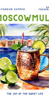 Dieses lebhafte Poster zeigt einen erfrischenden Moscow Mule, serviert in einem Kupferbecher, begleitet von frischen Limetten und einem Pool im Hintergrund. Mit kräftigen Farben und einer sommerlichen Atmosphäre fängt es die Freude an Zitrusfrüchten, Frische und Entspannung ein – ein perfektes Kunstwerk für Küchen, Bars oder sommerlich inspirierte Bilderwände.