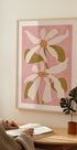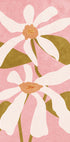 Dieses moderne abstrakte Blumenkunstwerk zeigt elegante weiße Blumen mit weichen Blütenblättern und erdigen grünen Blättern vor einem warmen pastellrosa Hintergrund. Das minimalistische und dennoch ausdrucksstarke Werk vereint botanische Schönheit mit moderner Illustration und verleiht jedem Interieur Frische und Charme.