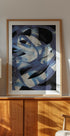Ein dynamisches abstraktes Poster mit schwungvollen Pinselstrichen in geschichteten Blau-, Schwarz- und Weißtönen. Der energiegeladene Fluss der Texturen erzeugt ein Gefühl von Rhythmus und Bewegung und vereint zeitgenössischen Ausdruck mit malerischer Eleganz – perfekt für skandinavische Innenräume, moderne Dekoration oder auffällige Galeriewände.
