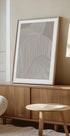 Ein minimalistisches abstraktes Poster mit organischen, fließenden weißen Linien auf einem sanften beigen Hintergrund. Die feinen, rhythmischen Muster sorgen für Bewegung und Struktur und verbinden natürliche Eleganz mit modernem Design. Perfekt für moderne Innenräume, die ruhige Wandkunst in neutralen Tönen wünschen.