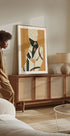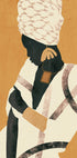 Ein auffälliges, minimalistisches Poster, das eine elegante Afrikanerin mit auffälligem Schmuck und gemustertem Kopftuch zeigt. Die erdigen Gelb- und Schwarztöne verbinden moderne Abstraktion mit kulturellem Reichtum und machen es zu einem starken Element in modernen und Boho-inspirierten Innenräumen.