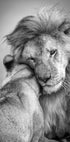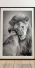 Ein berührendes Schwarz-Weiß-Wildtierplakat, das einen Löwen und eine Löwin in einer zärtlichen Umarmung zeigt. Dieses in der Serengeti Tansanias eingefangene Kunstwerk symbolisiert Liebe, Stärke und Hingabe in der Natur. Perfekt für Natur-, Tier- und romantische Innenräume.