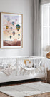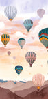 Ein verträumtes Poster mit bunten Heißluftballons, die über einem pastellfarbenen Himmel und Berggipfeln schweben. Das Kunstwerk drückt ein Gefühl von Abenteuer, Freiheit und Freude aus – ideal für Kinderzimmer, Reiseliebhaber oder als erhebende Wandkunst.