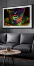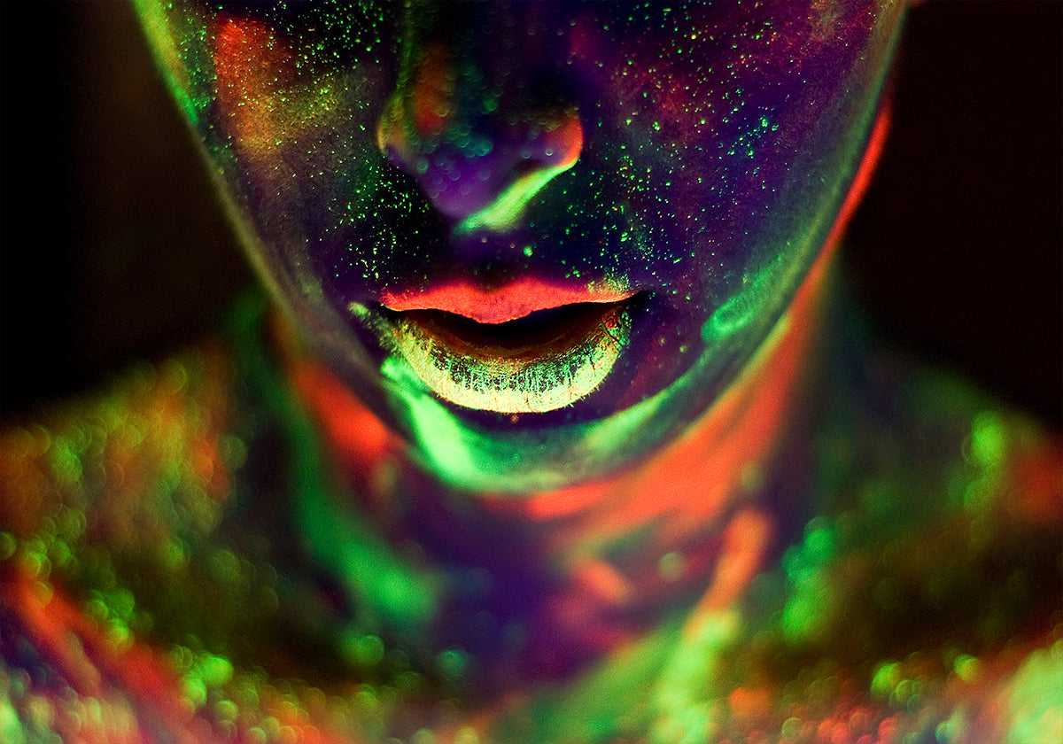 Ein eindrucksvolles Porträt, das unter UV-Licht leuchtet und bei dem Neonfarben das Gesicht in eine kosmische Leinwand verwandeln. Lebendige Grüntöne, feurige Rottöne und leuchtende Gelbtöne erhellen die Haut und schaffen eine surreale Mischung aus Geheimnis und Intensität. Dieses kühne Kunstwerk zelebriert Farbe, Licht und menschliche Stärke.
