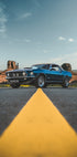 Ein klassischer blauer Ford Mustang parkt stolz auf der legendären Route 66, umgeben von endlosem Wüstenhimmel und hoch aufragenden Felsformationen. Dieses kraftvolle Bild fängt den Geist der Freiheit, Nostalgie und der amerikanischen Roadtrip-Kultur ein – eine zeitlose Hommage an Muscle-Cars, offene Autobahnen und Abenteuer.