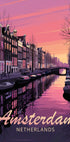 Ein stimmungsvolles Motiv aus Amsterdam: ein ruhiger Kanal mit kleinen Booten, die unter einer klassischen Brücke hindurchgleiten, flankiert von schmalen Giebelhäusern in warmen Farbtönen und grünen Bäumen. Im eleganten Retro-Ausdruck fängt Andreas Magnusson den zeitlosen Charme, das Fernweh und den Alltag der Stadt ein – ein Blickfang, der Ruhe und Präsenz schafft.