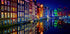 Eine brillante Nachtansicht der berühmten Grachtenhäuser Amsterdams, deren farbenfrohe Fassaden im Licht leuchten und sich perfekt im stillen Wasser spiegeln. Dieses lebendige Stadtbild zelebriert niederländische Architektur, urbanen Charme und die magischen Spiegelungen, die Amsterdam nach Einbruch der Dunkelheit unvergesslich machen.