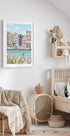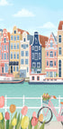 Eine farbenfrohe und bezaubernde Illustration der Stadt Amsterdam mit ihren ikonischen Grachtenhäusern, Fahrrädern, Tulpen und Booten. Das Kunstwerk fängt die Essenz der niederländischen Kultur ein, mit lebendigen Fassaden, ruhigen Kanälen und einer romantischen urbanen Atmosphäre. Perfekt für Reisende und alle, die sich vom europäischen Charme inspirieren lassen.