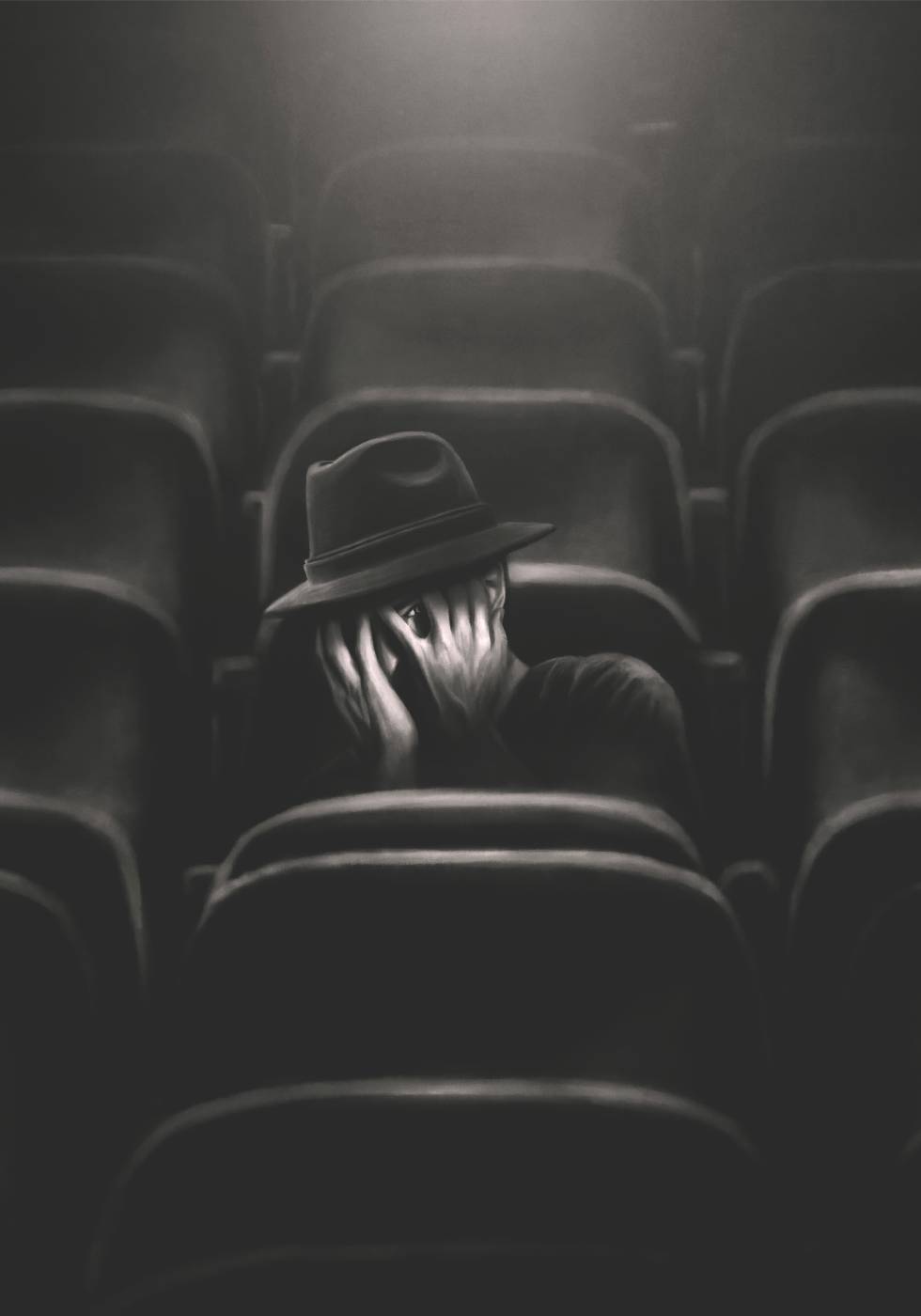 Ein intensives Schwarz-Weiß-Werk, das einen Mann allein in einem leeren Kino zeigt, den Kopf in den Händen vergraben und ein Auge herausschauend. Ein Symbol für Angst, Überwachung und existenzielle Einsamkeit.