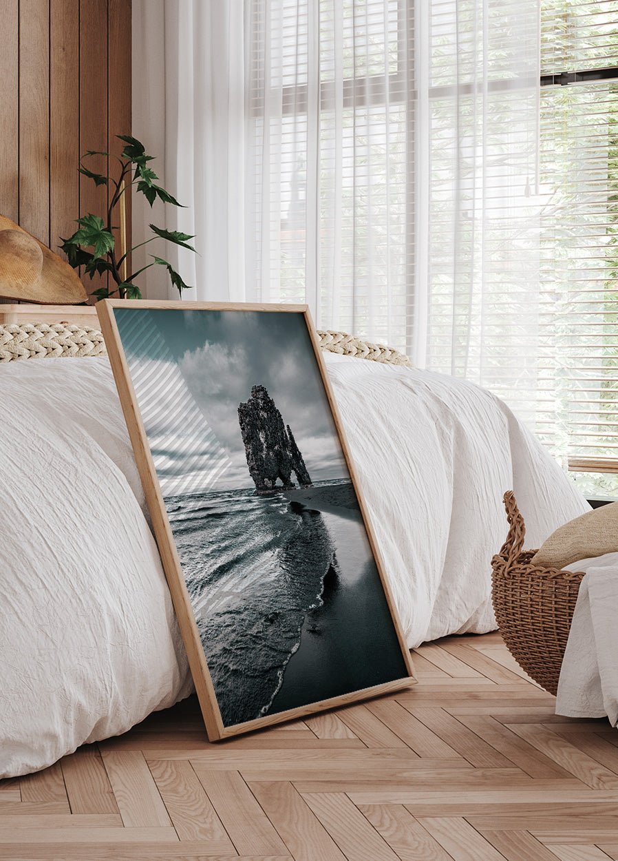 Dieses Poster zeigt den majestätischen Basalthaufen Hvitserkur, eine beeindruckende natürliche Formation in Island. Die dramatische Felsformation erhebt sich wie ein riesiges, ungewöhnliches skulpturales Monument aus dem Meer und bietet einen dramatischen und geheimnisvollen Ausblick auf die offene Landschaft. Perfekt, um jedem Raum einen Hauch einzigartiger natürlicher Schönheit und geologischer Faszination zu verleihen.