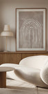 Ein minimalistisches abstraktes Poster mit handgezeichneten gewölbten Linien in klarem Weiß auf einem sanften beigefarbenen strukturierten Hintergrund. Die organische Geometrie und die neutralen Farbtöne sorgen für eine beruhigende Balance, ideal für japanische, skandinavische oder moderne minimalistische Innenräume.