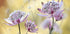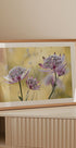 Ein zartes Nahaufnahme-Poster von Astrantia Major-Blüten in sanften Rosatönen vor einem warmen goldenen Hintergrund. Die Makroperspektive hebt die komplizierten Blütenblätter und dichten Blütenstände hervor und schafft so ein verträumtes botanisches Kunstwerk, das den Charme der Natur in Ihr Zuhause bringt.