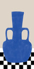 Ein kühnes modernes Kunstwerk mit einer tiefblauen Vase vor einem minimalistischen beigen Hintergrund und einem auffälligen schwarz-weiß karierten Boden. Dieses geometrische und zeitgenössische Stillleben kombiniert Abstraktion mit Innenarchitekturästhetik und schafft einen stilvollen visuellen Mittelpunkt.