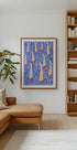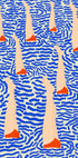 Eine kühne und verspielte Illustration von Synchronschwimmern, die kopfüber mit ausgestreckten Beinen aus dem gemusterten blauen Wasser dargestellt sind. Die leuchtend roten Badeanzüge kontrastieren mit den rhythmischen wellenartigen Wellen und schaffen eine lebendige abstrakte Komposition, die Sport, Humor und modernes Design vereint.