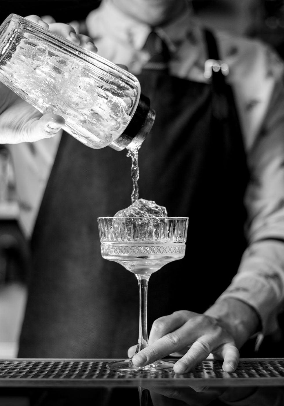 Ein stilvolles Schwarz-Weiß-Foto, das einen Barkeeper zeigt, der einen Cocktail in ein klassisches Coupé-Glas gießt. Das Eis glitzert, während die Flüssigkeit fließt, und schafft so eine zeitlose Mixologie-Szene. Perfekt für Bardekoration, Cocktail-Enthusiasten oder diejenigen, die die Kunst des Barkeepers schätzen.