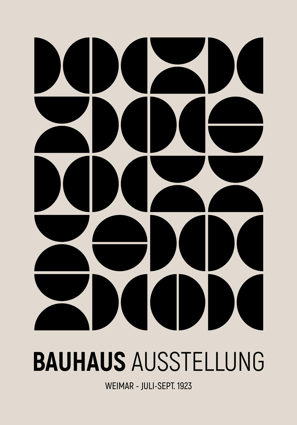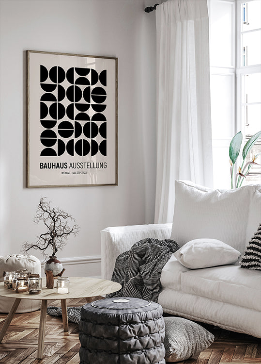 Inspiriert von der Bauhaus-Ausstellung 1923 zeigt dieses Grafikplakat die Schönheit der Einfachheit mit schwarzen Formen in systematischen Reihen. Eine visuelle Hommage an die Moderne.