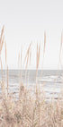Ein sanftes Küstenfoto mit hohen Strohhalmen, die an der Küste schwanken, mit dem Meer im Hintergrund. Die natürlichen Beigetöne und der ruhige Horizont schaffen eine entspannte Atmosphäre, ideal für ruhige, von der Natur inspirierte Innenräume.