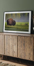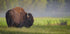 Ein beeindruckendes Naturfoto eines einsamen Bisons, der bei Sonnenaufgang auf einer nebligen Wiese steht. Das im Yellowstone-Nationalpark aufgenommene Bild unterstreicht die rohe Kraft und Majestät eines der berühmtesten Tiere Amerikas, umgeben von der ruhigen Schönheit des Morgenlichts.