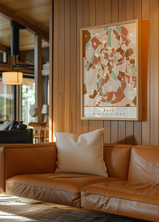 Ein eindrucksvoller Stadtplan von Rom in Erdtönen: dichtes Straßennetz, elegante Flusslinien und markante Viertel, gezeichnet in tiefschwarzen Feldern und warmen, gedämpften Farbtönen. Emiliano Deificus vereint grafische Präzision und poetische Ruhe in einem minimalistischen Ausdruck, der sowohl moderne als auch klassische Räume aufwertet. Perfekt als Blickfang im Wohnzimmer, Büro oder Eingangsbereich.