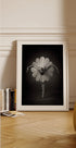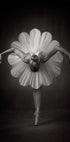 Eine poetische Schwarz-Weiß-Fotografie einer Ballerina, bei der die Form des Tutus einer Blume ähnelt. In einer anmutigen Pose auf Zehenspitzen eingefangen, vereint das Bild Eleganz, Haltung und botanische Symbolik in einer verträumten Kombination aus Tanz und Natur.
