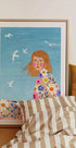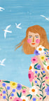 Eine skurrile und farbenfrohe Illustration einer Frau, eingehüllt in einen Blumenumhang vor einem klaren blauen Himmel. Umgeben von fliegenden Vögeln ruft das Werk Freiheit, Freude und den frischen Geist des Frühlings hervor. Legendär, aber auch ruhig, vereint es Natur und Fantasie in einem lebendigen, modernen Stil.
