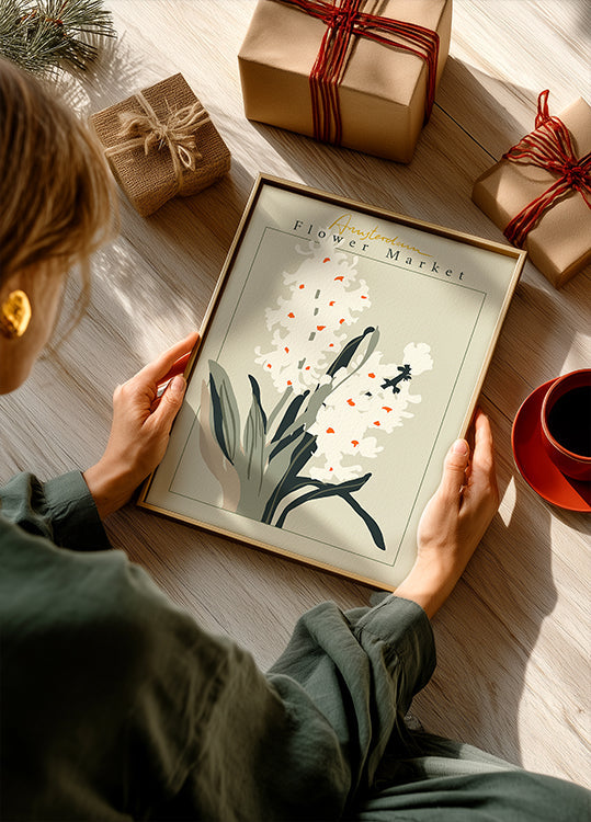 Eine grafische Hommage an Amsterdam: Eine stilisierte Hyazinthe steht als Marktikone, umgeben von kräftiger Typografie und kühlen, nordischen Farbtönen. Das Poster bringt winterliche Ruhe mit dem Versprechen des Frühlings in Einklang. Entworfen von Annick und geschaffen, um Ihrem Zuhause einen frischen botanischen Schwerpunkt mit elegantem, modernem Charme zu verleihen. Im skandinavischen Ton.