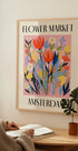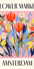 Ein farbenfrohes Poster im Retro-Stil mit auffälligen Tulpen und Wildblumen auf einem leuchtend rosa Hintergrund. Inspiriert von Amsterdams berühmten Blumenmärkten verbindet dieses Kunstwerk Reisenostalgie mit botanischem Charme und bringt Leben in jede Einrichtung.