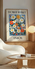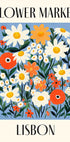 Ein bezauberndes Retro-Poster mit Gänseblümchen, Mohn und Wildblumen in warmen Orange-, Weiß- und Gelbtönen auf blauem Hintergrund. Inspiriert von den lebhaften Blumenmärkten Lissabons fängt dieses Kunstwerk europäische Reisenostalgie und botanische Schönheit ein.