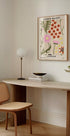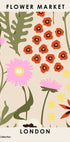 Ein auffälliges Poster im Mid-Century-Stil mit grafischen Blumen in Rot, Rosa und Gelb auf beigem Hintergrund. Es repräsentiert Londons lebhafte Blumenmärkte und verbindet Retro-Stil mit botanischem Charme.