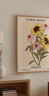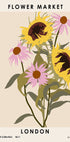 Ein bezauberndes Blumenposter mit goldenen Sonnenblumen und zartrosa Blüten. Dieses moderne, Vintage-inspirierte Kunstwerk zelebriert die Blumenpracht Londons und die lebhafte Atmosphäre des Sommers.