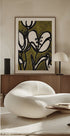 Janel Braggs abstrakte Tulpen tanzen in moosgrünen Tönen, wobei sich schwarze Tuschelinien wie elegante Striche über ein olivgrünes Feld winden. Die Komposition vereint dunkle Romantik und modernes Zen – energisch und doch beruhigend – eine poetische botanische Aussage für das Wohnzimmer, Schlafzimmer oder Büro. Schafft Ruhe und Präsenz im Raum.
