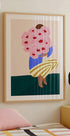 Eine moderne abstrakte Illustration einer Frau, die einen großen Strauß rosa Blumen hält, bemalt in kräftigen und lebendigen Farben. Mit seinen minimalistischen Formen, den gestreiften Hosen und dem modernen Design passt dieses Kunstwerk perfekt in stilvolle Innenräume. Eine verspielte und dennoch elegante Wanddekoration.