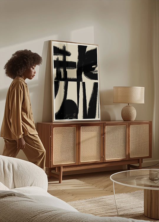 Ein auffälliges monochromes abstraktes Kunstwerk mit kräftigen schwarzen Pinselstrichen auf neutralem Hintergrund. Die strukturierten Linien und ausdrucksstarken Formen schaffen ein dynamisches Gleichgewicht zwischen Bewegung und Stille und machen es zu einem modernen Statement im zeitgenössischen Dekor.
