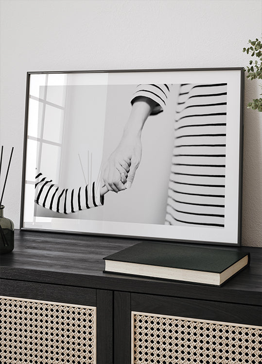 Dieses berührende Schwarz-Weiß-Poster fängt die Schönheit von Verbindung und Vertrauen ein. Ein zärtlicher Moment zwischen zwei Händen, umrahmt von gestreifter Kleidung, symbolisiert Liebe, Familie und Gemeinschaft. Minimalistisch und dennoch zutiefst emotional, ein zeitloses Stück, das perfekt in moderne und klassische Häuser passt.