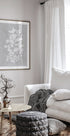 Ein minimalistisches botanisches Illustrationsposter mit zarten weißen Blumensilhouetten vor einem weichen grauen Hintergrund mit Leinenstruktur. Elegante und moderne Wandkunst, die jedem Raum Ruhe und Raffinesse verleiht, perfekt für skandinavische, japanische und minimalistische Innenräume.