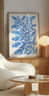 Ein zarter botanischer Druck mit handgemalten blauen Blättern auf weißem Hintergrund. Der Aquarellstil vereint Minimalismus mit Eleganz und ist somit eine vielseitige Wahl für moderne Innenräume. Perfekt, um jedem Raum eine frische und natürliche Note zu verleihen.