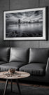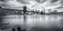 Ein dramatisches schwarz-weißes Stadtbild der Brooklyn Bridge, die den Hudson River überspannt, mit Manhattans ikonischer Skyline im Hintergrund. Die eindrucksvollen Wolken und die lange Belichtung des Wassers schaffen eine zeitlose, filmische Atmosphäre, die die Essenz von New York einfängt.