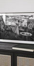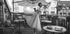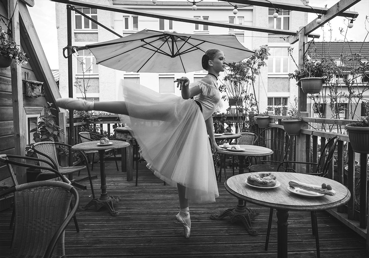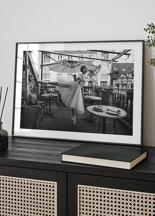 Auf diesem eleganten Schwarz-Weiß-Foto posiert eine anmutige Ballerina auf einer Caféterrasse. Durch die Kombination aus Tanz, Architektur und Stadtleben in einem Café entsteht ein poetisches und zeitloses Kunstwerk.