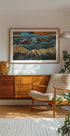 Eine atemberaubende Luftaufnahme der kalifornischen Wüstenlandschaft, die die kunstvollen Bäche und Deltas der Natur über den Sanddünen zeigt. Die komplizierten, aderartigen Muster in Blau und Gold schaffen ein abstraktes Meisterwerk, in dem sich Erde und Wasser in Harmonie vereinen. Ein auffälliges fotografisches Wandkunstwerk für moderne Innenräume.