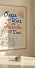 Ein bezauberndes typografisches Poster mit dem Text „Cheese and Wine and Friends with Time“, illustriert mit einem zum Toast erhobenen Weinglas und einem Käseteller im Skizzenstil. Dieses verspielte Design ist perfekt für Küchen, Esszimmer und Weinliebhaber und feiert Freundschaft, Essen und gute Momente.