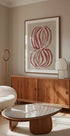 Crimson Echoforms af THE MIUUS STUDIO forener bløde beige toner med dybe røde former i et balanceret, grafisk stilleben. Halvcirkler, striber og rektangler danner rytmiske ekkoer omkring en stiliseret vase og skål, som skaber rolig bevægelse, retro-charme og tidløs, moderne minimalisme i en harmonisk komposition med akvareltekstur.