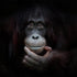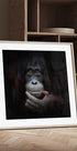 Eine intensive Nahaufnahme eines lächelnden, nachdenklichen Orang-Utans, aufgenommen bei schwachem, stimmungsvollem Licht, das die Textur des Fells und die tiefen, menschlichen Augen hervorhebt. Das von der deutschen Fotografin Antje Wenner-Braun im Rostocker Zoo fotografierte Motiv lädt zum stillen Nachdenken und einer warmen, einfühlsamen Ruhe im Raum ein. Perfekt für das Wohnzimmer, das Büro oder den kreativen Raum.