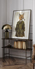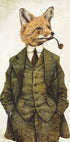 Ein charmantes, anthropomorphes Porträt eines Fuchses in einem maßgeschneiderten Anzug, mit Pfeife und vornehmer Mine und aristokratischem Wesen – eine Anspielung auf die klassische Eleganz der Vintage-Porträtmalerei. Mike Koubous Arbeit vereint Humor und Nostalgie in einem klaren, grün gefärbten Universum, das sowohl das Wohnzimmer als auch die Arbeitswand zum Leben erweckt – mit Persönlichkeit.