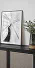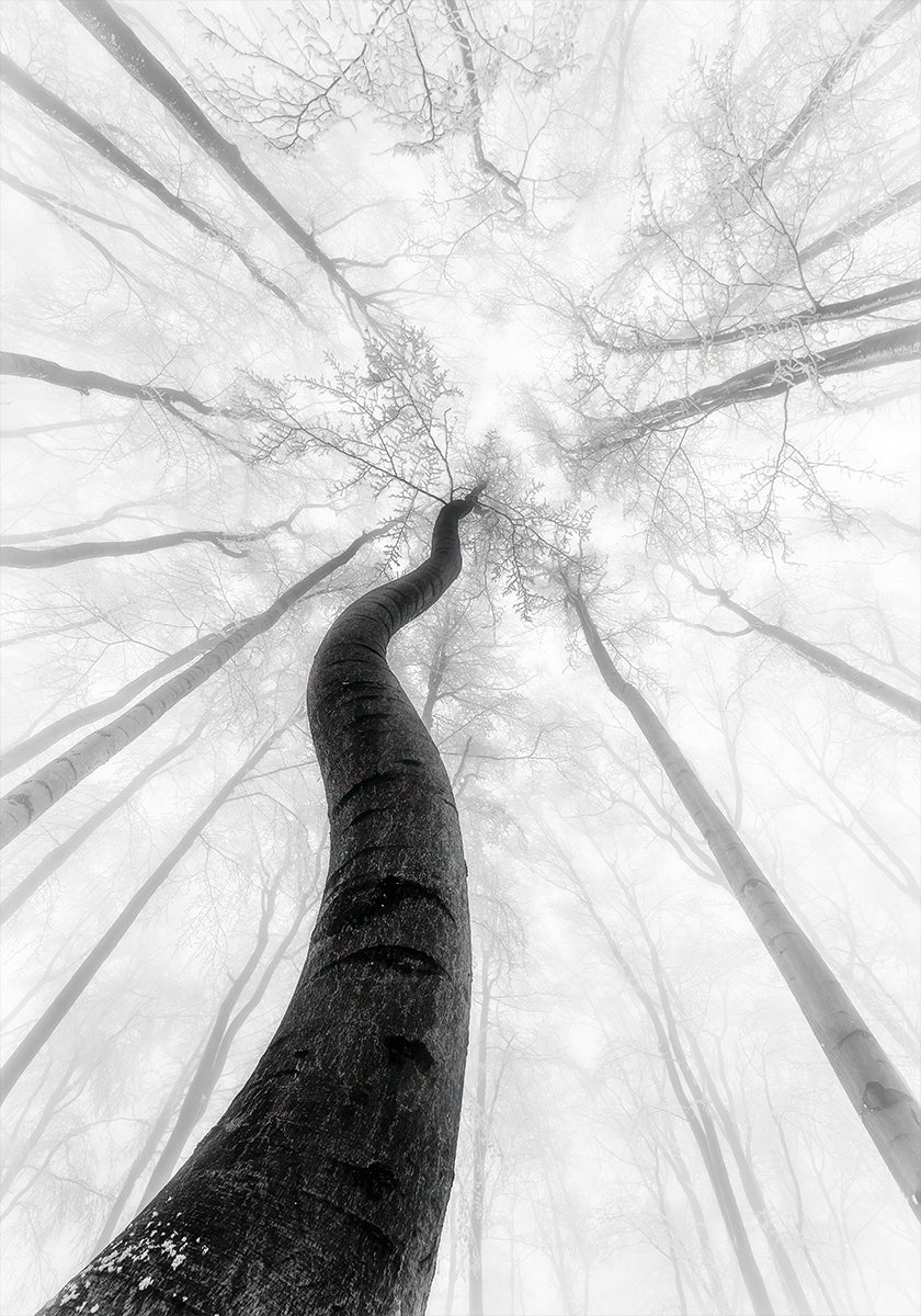Ein ruhiger Wintermoment, eingefangen vom Fotografen Tom Pavlasek: Schlanke Buchen stehen im Schnee, eingehüllt in Nebel und Frost. Die sanften Grau- und Weißtöne erzeugen Tiefe und Ruhe, während die wiederholten Linien grafische Linien in die Landschaft zeichnen. Eine minimalistische, nordische Atmosphäre für Ihr Zuhause. Perfekt für Räume, die Klarheit, Stille und Natur suchen.