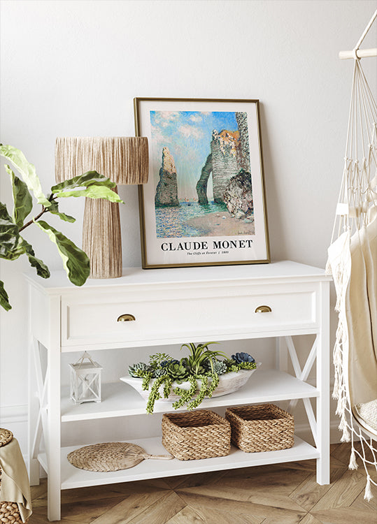 Ein atemberaubendes impressionistisches Gemälde von Claude Monet, das die berühmten Klippen von Étretat darstellt. Mit seinen charakteristischen Pinselstrichen und lichtreflektierenden Farben fängt diese klassische Meereslandschaft die raue Schönheit der Natur ein. Perfekt für Kunstliebhaber und Monet-Bewunderer.