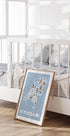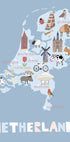 Ein verspieltes, farbenfrohes Holland-Poster der Künstlerin Carla Daly: eine illustrierte Karte von Amsterdam, Rotterdam und Eindhoven, Kanälen und Windmühlen, Tulpen und Fahrrädern. Tiere wie Kühe, Schafe und Vögel erwecken das Land zum Leben, während ikonische Orte wie Evoluon das Motiv zieren. Perfekt für das Kinderzimmer oder Reiseträume.