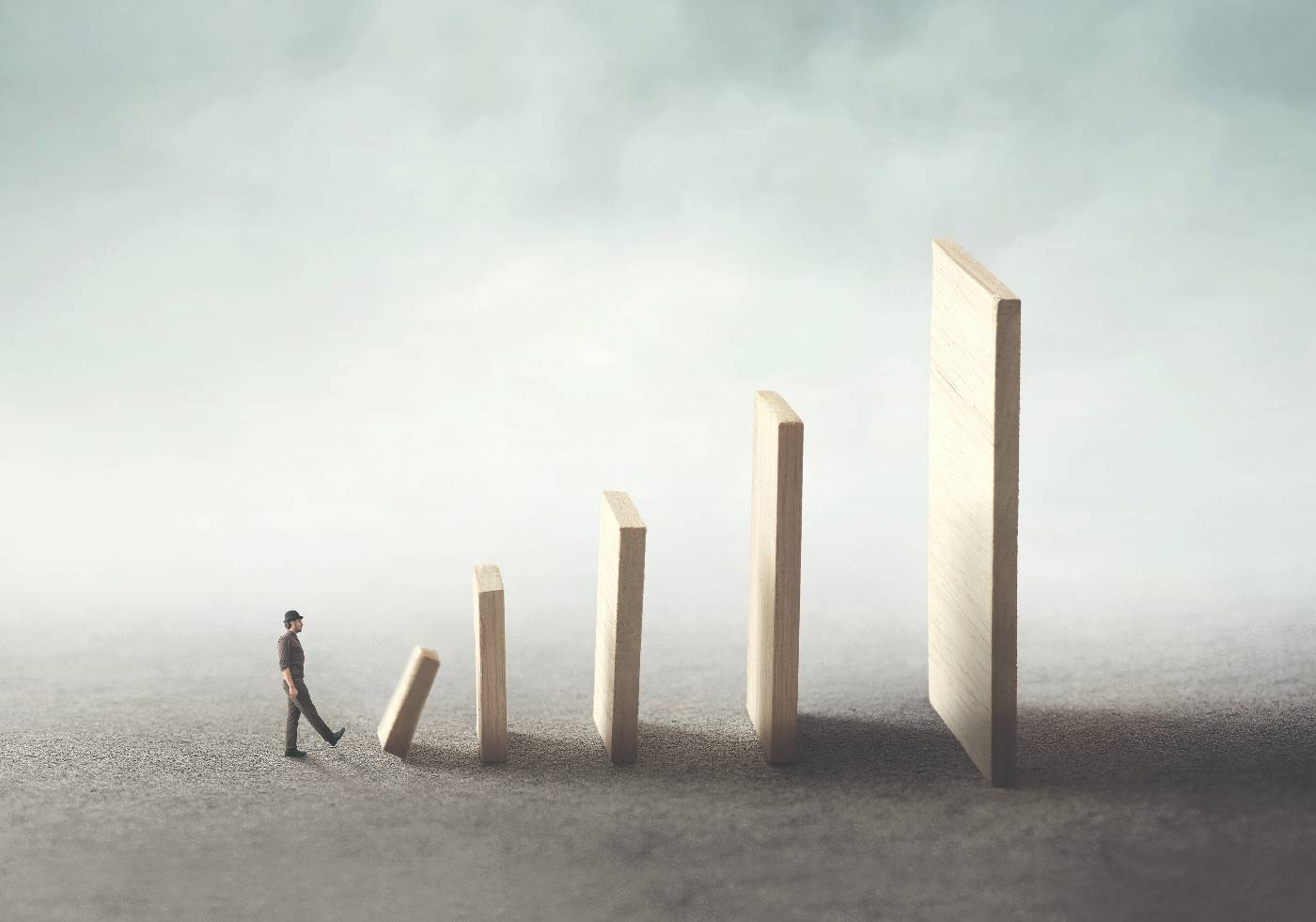 Eine surreale visuelle Metapher – ein kleiner Mann, der den ersten von vielen wachsenden Dominosteinen umstößt. Ein kraftvolles Bild, das zeigt, wie kleine Taten große Konsequenzen haben können – ideal für nachdenkliche oder motivierende Räume.