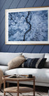 Ein eisblauer Fluss schneidet aus der Luft durch eine schneebedeckte Landschaft, in der Frostspuren klare Linien zwischen dunklen Bäumen und weißen Weiten ziehen. Die kühle Farbpalette und der ruhige Rhythmus der Kurven fangen die ruhige Intensität des Winters ein. Fotokunst von Daniel Gastager, die raue Natur und poetische Ruhe in Einklang bringt. Schafft Tiefe und Ruhe im Raum.