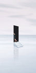 Ein surreales konzeptuelles Kunstwerk, das eine Person zeigt, die durch eine dunkle Tür über ruhiges, spiegelndes Wasser tritt. Die minimalistische Anordnung mit einer Treppe, die ins Nichts führt, ruft Themen wie Flucht, Aufbruch und Neuanfang hervor. Die Szene vermischt traumhaften Surrealismus mit einer von der Mitte des Jahrhunderts inspirierten Ästhetik.