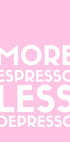 Ein verspieltes, minimalistisches Typografie-Poster mit weißem Text auf einem zartrosa Hintergrund. Das lustige Zitat „More Espresso Less Depresso“ bringt Humor und Motivation, perfekt für Kaffeeliebhaber und moderne Inneneinrichtung. Ein lustiges Statement für Küchen, Cafés oder Büros.